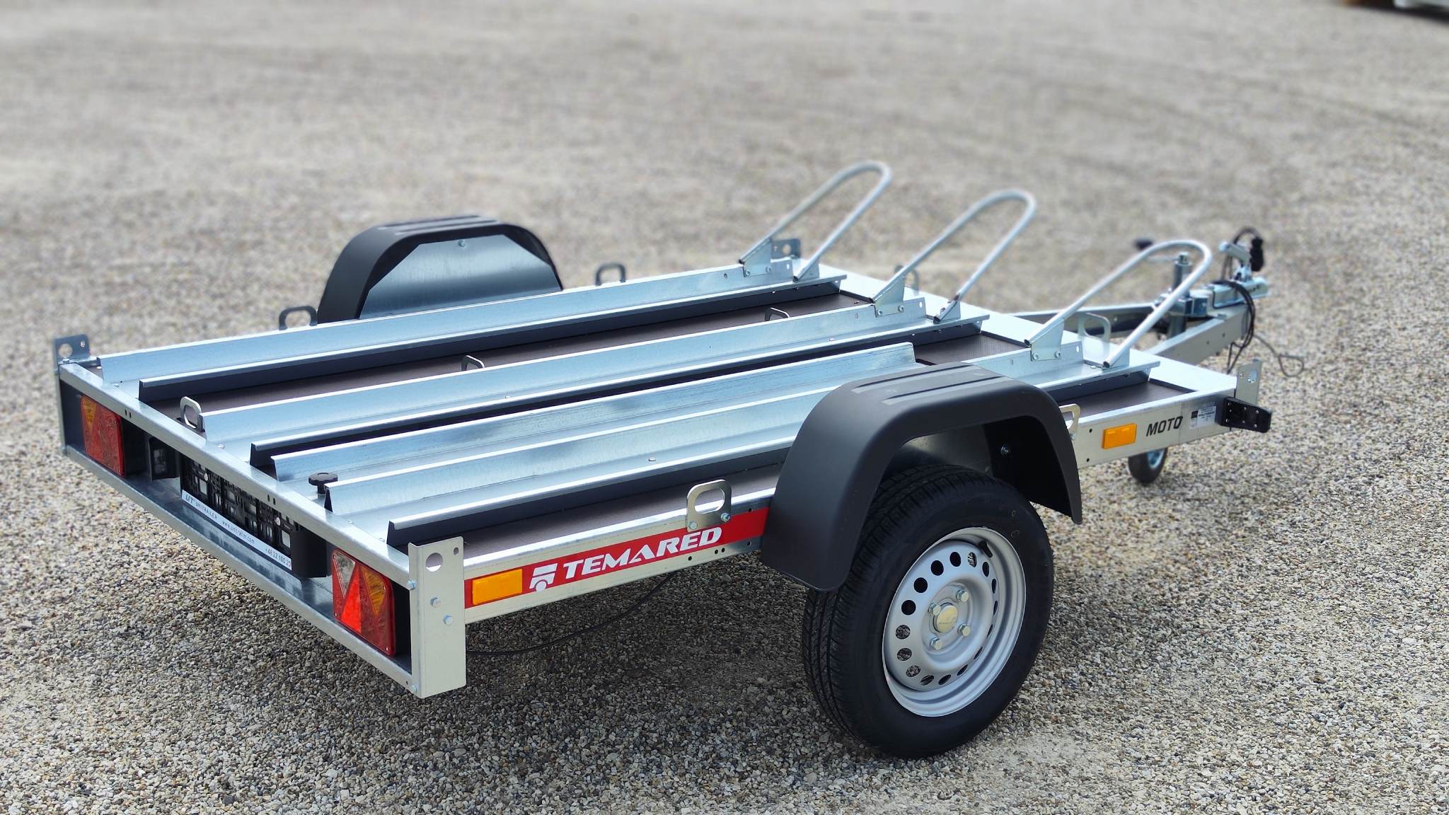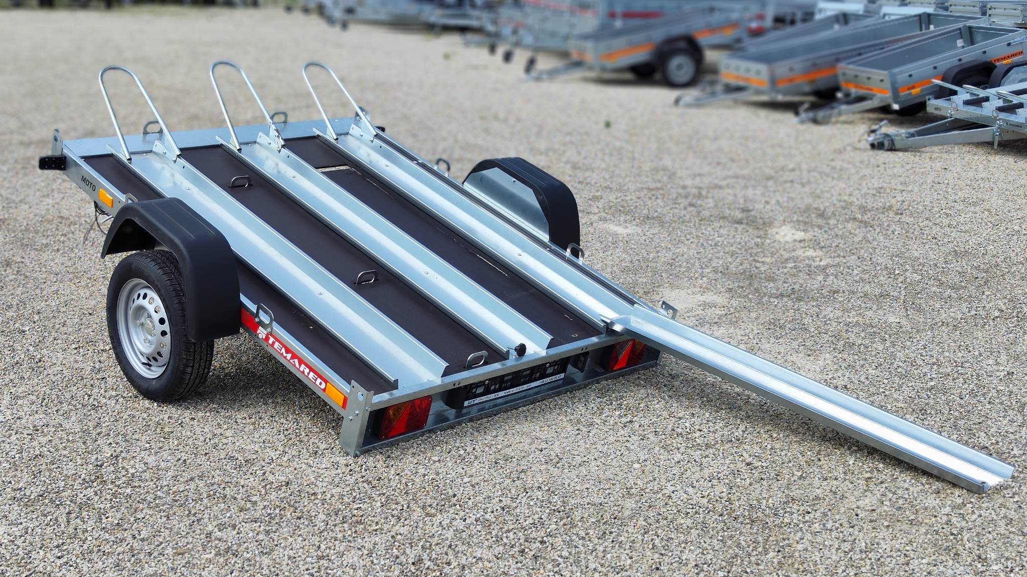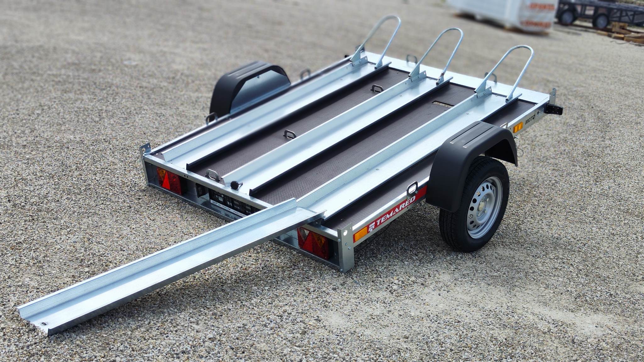 Temared Moto 3 típusú 3 motoros motorszállító utánfutó plywood padlóbéléssel. Horganyzott acéllemez alváz és motorszállító kiegészítők. Az ár tartalmazza a 3db sínt kerékívvel, padlóbélést valamint a rámpát. Körben lekötözéshez fülek. A plató billenthető igény esetén, alacsonyabb hasmagasságú motorral is fel lehet állni rá lebillentett állapotban. Az ár nem tartalmazza a képeken látható támkereket. A nálunk vásárolt pótkocsikat igény esetén forgalomba helyezzük, nagy többségében 3-5 munkanap alatt, lebonyolítható interneten keresztül otthonról is, elegendő csak az átvételkor eljönni telephelyünkre. A képek illusztrációs jelleggel készültek. A pontos felszereltségről és kiegészítőkről vásárlás előtt kérjük tájékozódjon elérhetőségeink egyikén, amennyiben az a leírásból nem derül ki egyértelműen.