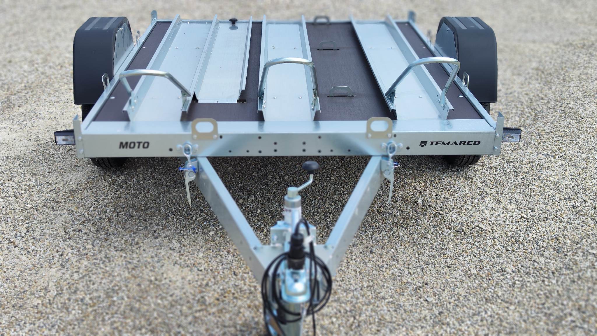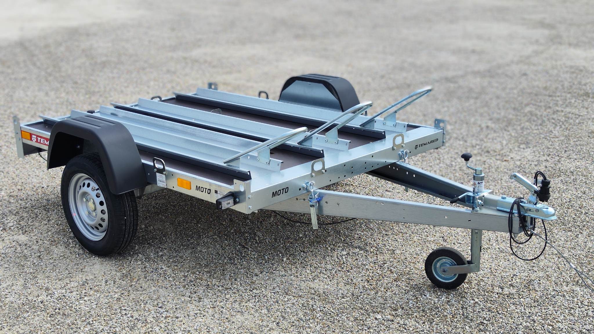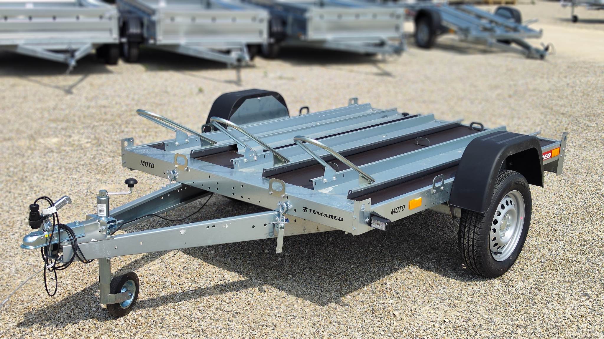Temared Moto 3 típusú 3 motoros motorszállító utánfutó plywood padlóbéléssel. Horganyzott acéllemez alváz és motorszállító kiegészítők. Az ár tartalmazza a 3db sínt kerékívvel, padlóbélést valamint a rámpát. Körben lekötözéshez fülek. A plató billenthető igény esetén, alacsonyabb hasmagasságú motorral is fel lehet állni rá lebillentett állapotban. Az ár nem tartalmazza a képeken látható támkereket. A nálunk vásárolt pótkocsikat igény esetén forgalomba helyezzük, nagy többségében 3-5 munkanap alatt, lebonyolítható interneten keresztül otthonról is, elegendő csak az átvételkor eljönni telephelyünkre. A képek illusztrációs jelleggel készültek. A pontos felszereltségről és kiegészítőkről vásárlás előtt kérjük tájékozódjon elérhetőségeink egyikén, amennyiben az a leírásból nem derül ki egyértelműen.