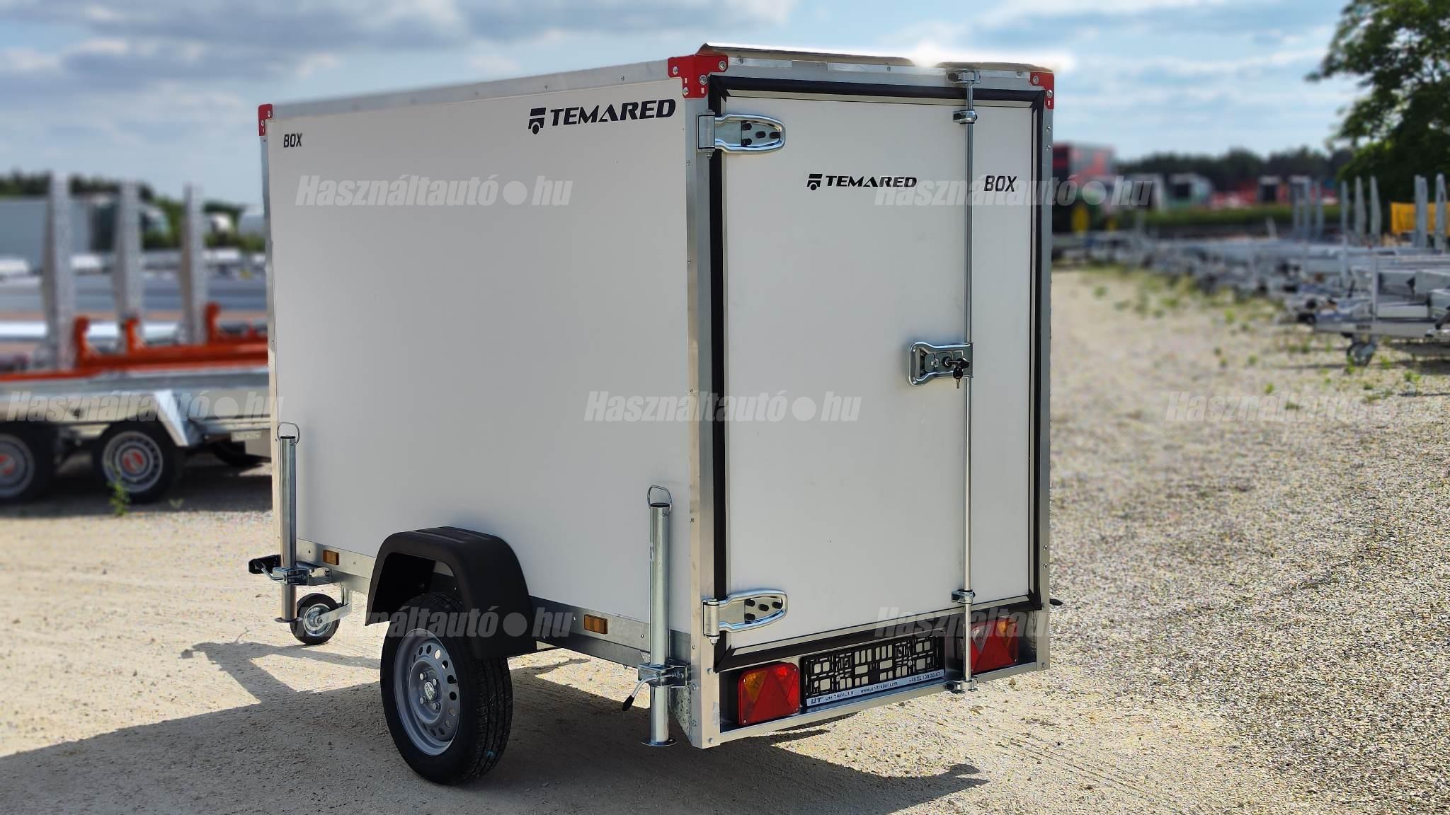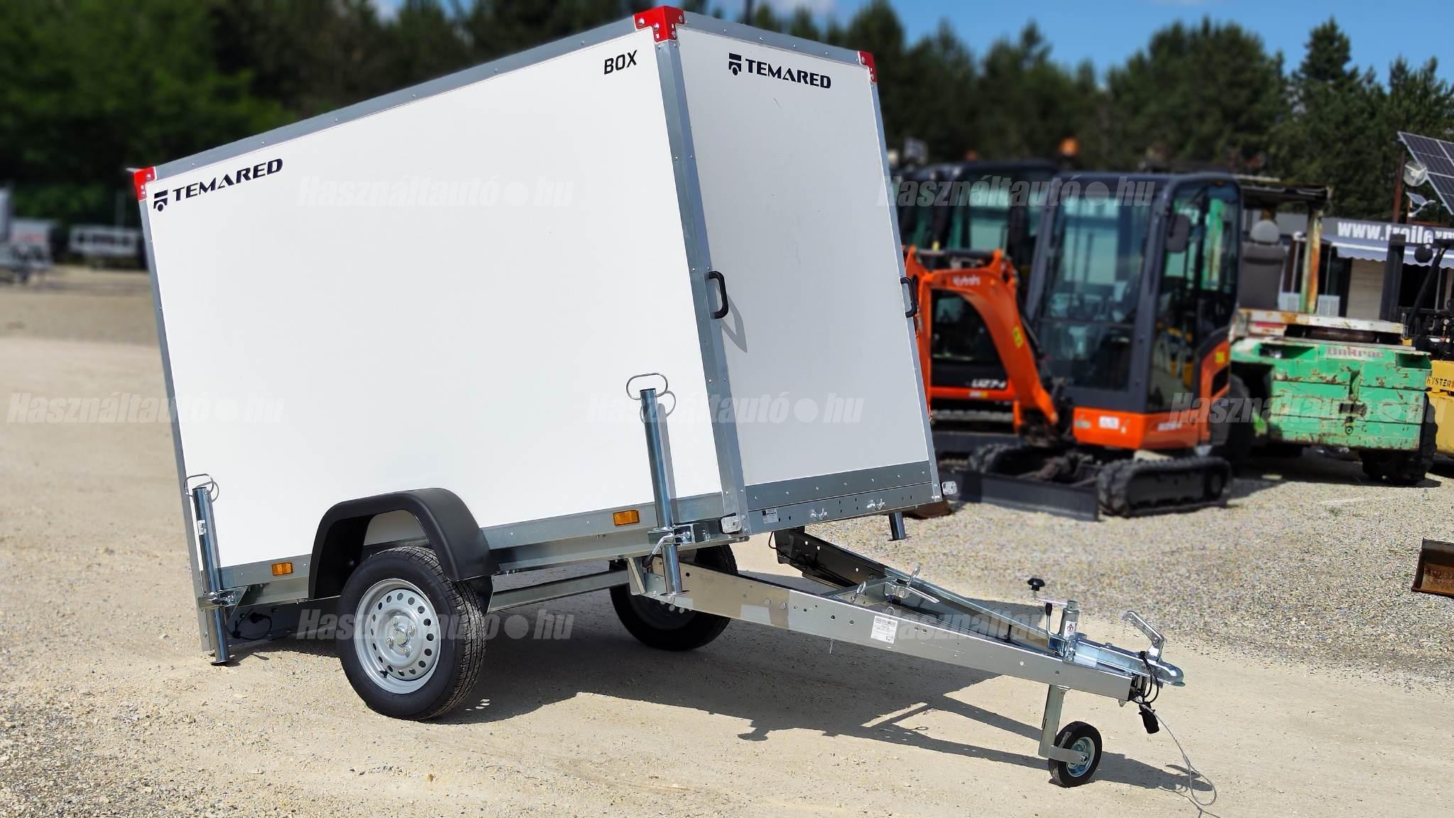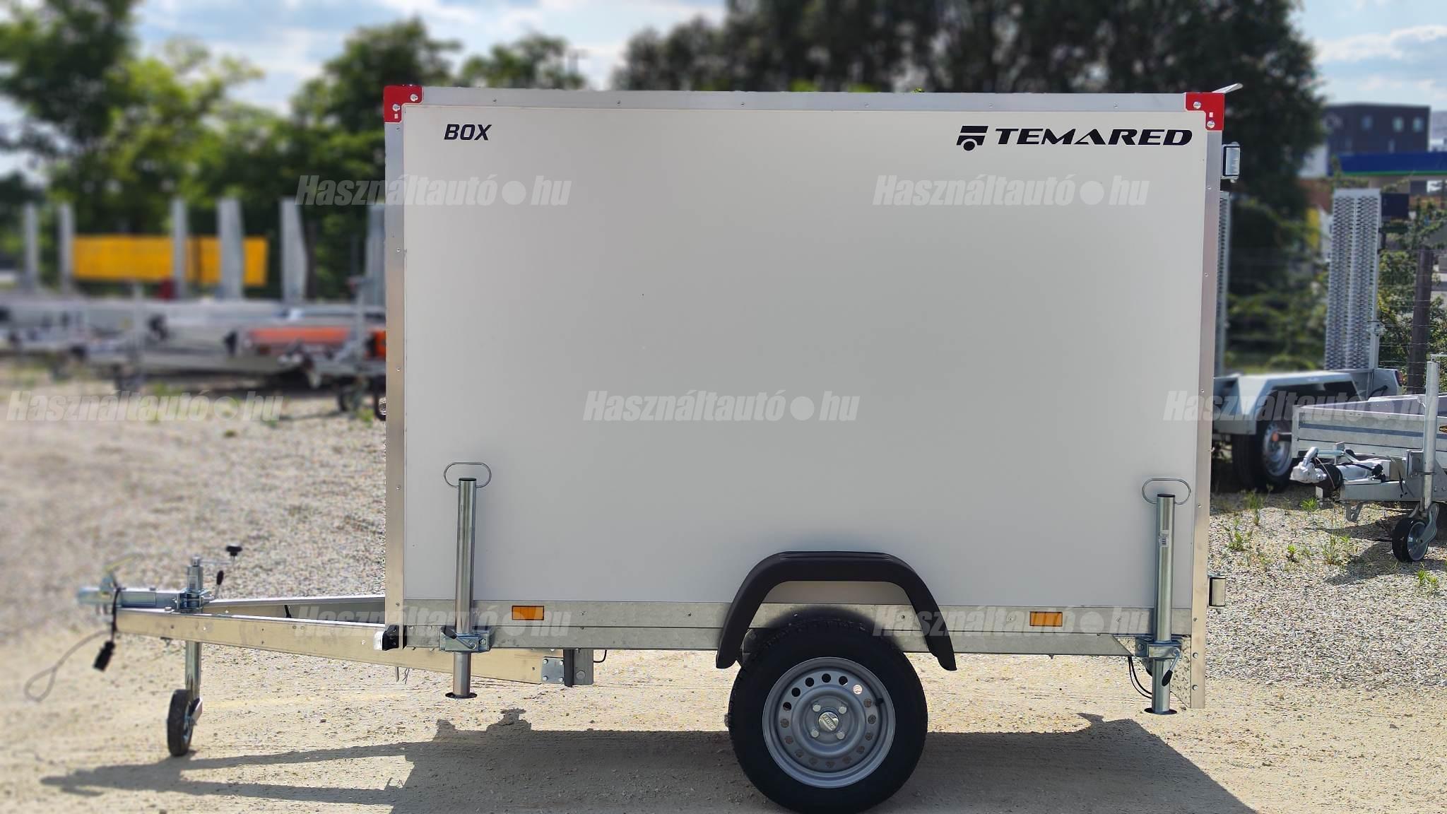 Temared Smartbox 2312 típusú 1 tengelyes zárt dobozos utánfutó. A hasznos belső méret 233 x 125 x 146cm, a hátsó ajtó nyílás mérete 140 x 113cm. Egyben nyíló hátsó ajtó. Plywood rétegelt lemez padló és doboz felépítmény. Horganyzott acéllemez alváz. Billenthető dobozfelépítmény a könnyebb feljárás érdekében az esetleges járműszállításhoz, 4db lekötöző fül a padlóban. Kulccsal zárható hátsó ajtó. A támkerék és a 4db támasztó láb tartozéka. A nálunk vásárolt pótkocsikat igény esetén forgalomba helyezzük, nagy többségében 3-5 munkanap alatt, lebonyolítható interneten keresztül otthonról is, elegendő csak az átvételkor eljönni telephelyünkre. A képek illusztrációs jelleggel készültek. A pontos felszereltségről és kiegészítőkről vásárlás előtt kérjük tájékozódjon elérhetőségeink egyikén, amennyiben az a leírásból nem derül ki egyértelműen.
