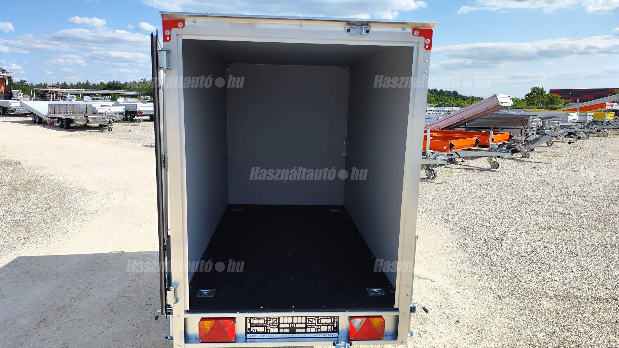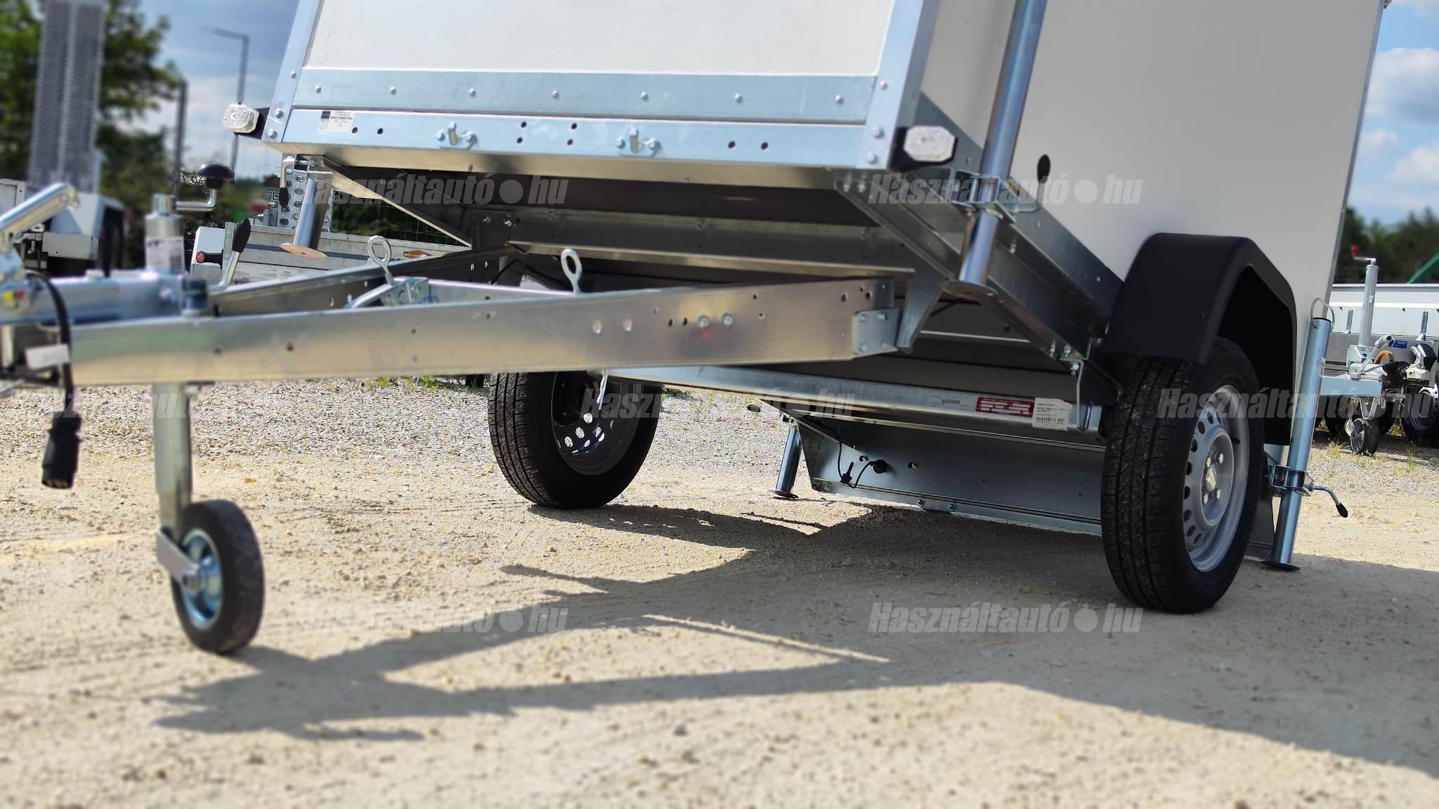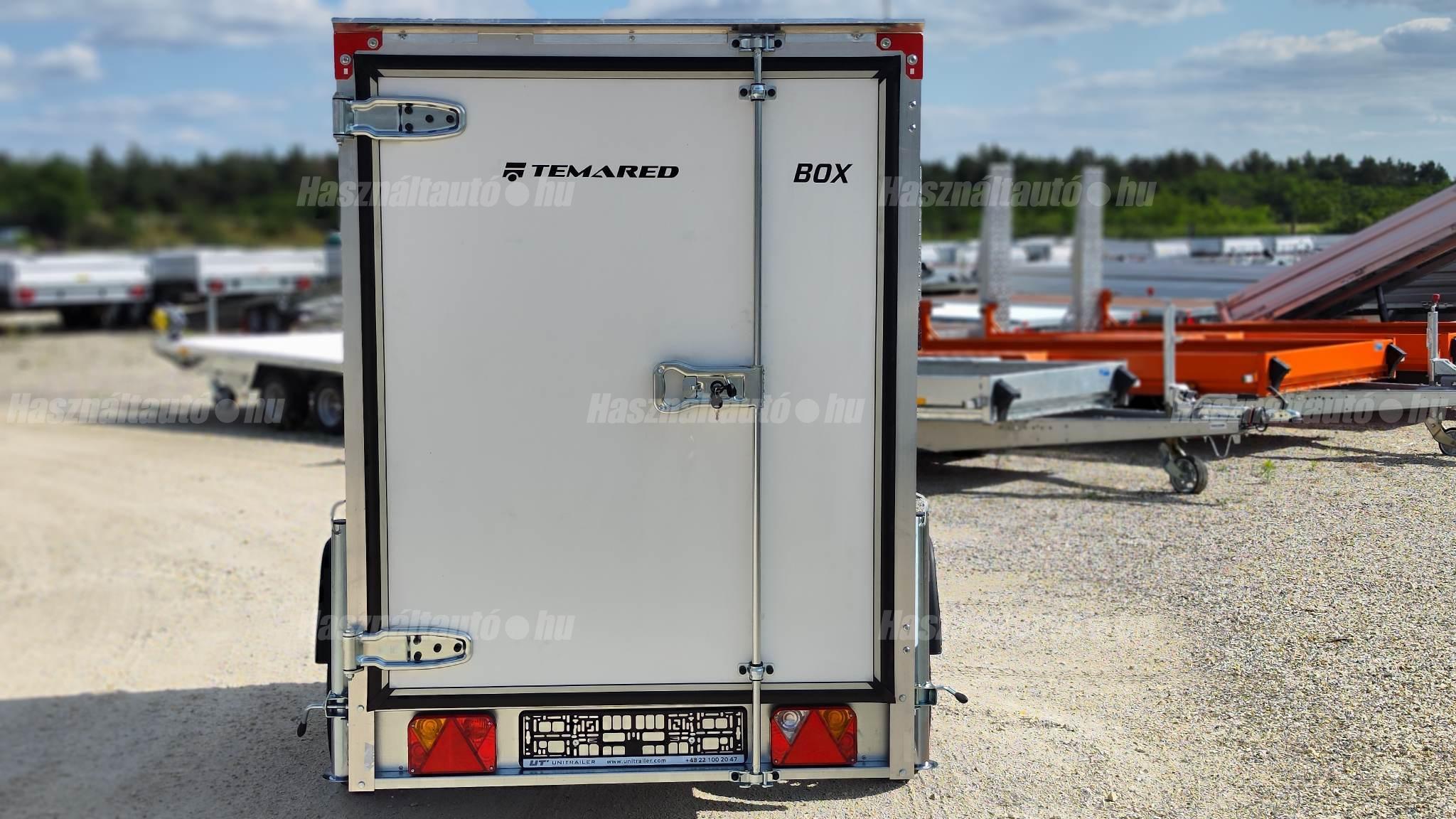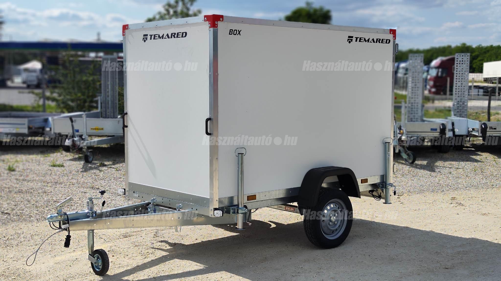 Temared Smartbox 2312 típusú 1 tengelyes zárt dobozos utánfutó. A hasznos belső méret 233 x 125 x 146cm, a hátsó ajtó nyílás mérete 140 x 113cm. Egyben nyíló hátsó ajtó. Plywood rétegelt lemez padló és doboz felépítmény. Horganyzott acéllemez alváz. Billenthető dobozfelépítmény a könnyebb feljárás érdekében az esetleges járműszállításhoz, 4db lekötöző fül a padlóban. Kulccsal zárható hátsó ajtó. A támkerék és a 4db támasztó láb tartozéka. A nálunk vásárolt pótkocsikat igény esetén forgalomba helyezzük, nagy többségében 3-5 munkanap alatt, lebonyolítható interneten keresztül otthonról is, elegendő csak az átvételkor eljönni telephelyünkre. A képek illusztrációs jelleggel készültek. A pontos felszereltségről és kiegészítőkről vásárlás előtt kérjük tájékozódjon elérhetőségeink egyikén, amennyiben az a leírásból nem derül ki egyértelműen.