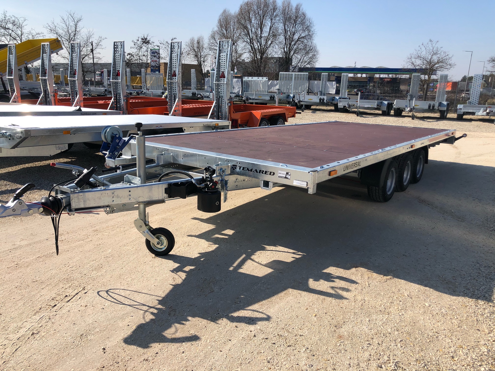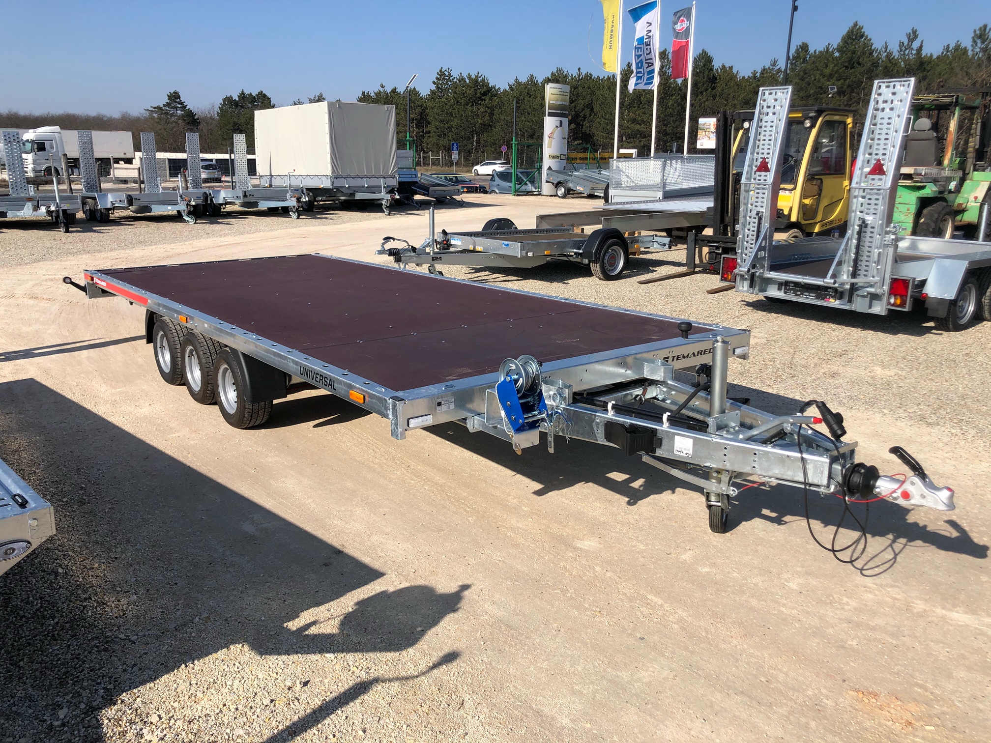 Temared Universal 5121/3 típusú 3 tengelyes hidraulikusan billenthető platós autó, gép és áruszállító kivitel. Tüzihorganyzott acél alváz, rétegelt lemez teli padozat, 1 pár alumíniumrámpa. Kézi csörlő tartozéka. A nálunk vásárolt pótkocsikat igény esetén forgalomba helyezzük, nagy többségében 3-5 munkanap alatt, lebonyolítható interneten keresztül otthonról is, elegendő csak az átvételkor eljönni telephelyünkre. A képek illusztrációs jelleggel készültek. A pontos felszereltségről és kiegészítőkről vásárlás előtt kérjük tájékozódjon elérhetőségeink egyikén, amennyiben az a leírásból nem derül ki egyértelműen.